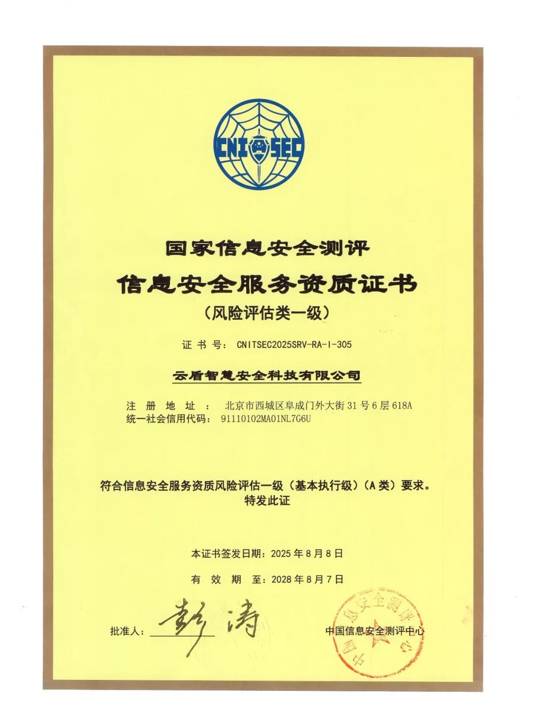 此次获得国测信息安全服务风险评估类资质,是对公司在风险识别、威胁研判、策略优化等核心能力的全面肯定。通过严谨的评估流程和高标准的技术考验,展现了云盾智慧在复杂网络环境下精准定位潜在风险、制定有效防御方案的专业水准。
