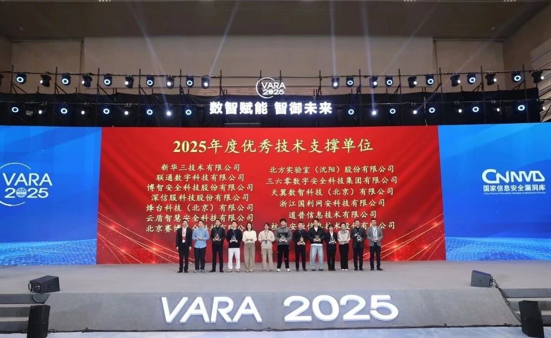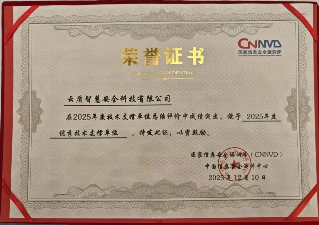 在网络漏洞治理生态分论坛上,云盾智慧凭借在漏洞研究、风险预警、技术响应等方面的卓越表现,被国家信息安全漏洞库(CNNVD)与中国信息安全测评中心联合授予“2025年度优秀技术支撑单位”荣誉称号,并获颁荣誉证书。这一殊荣是对云盾智慧漏洞发现与报送、应急响应等方面能力的认可。