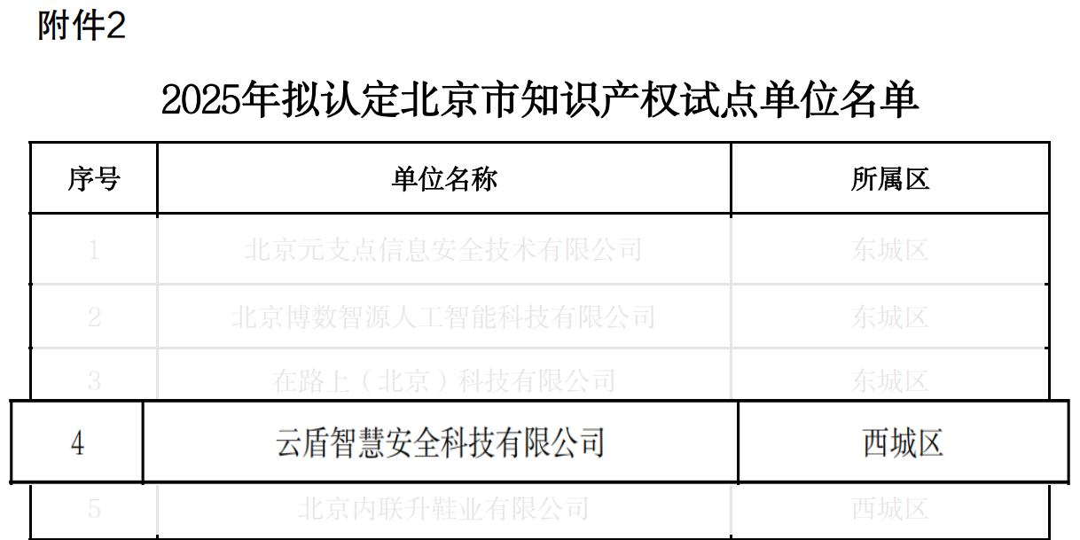 近日,北京市知识产权局发布了2025年拟认定北京市知识产权试点优势单位及复审通过单位名单公示的通知。云盾智慧凭借在知识产权管理与创新方面的突出表现,成功获批成为2025年度北京市知识产权试点单位。