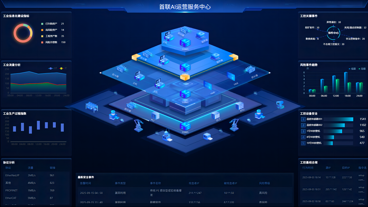 工作人员现场通过工控沙盘与大屏联动带大家直观体验“首联AI运营服务中心”,展示其安全智盾、自主可信、极速响应、全域联防、智能协同的五S核心优势。国家互联网安全应急中心、云南出入境边防检查总站、南方电网等多家单位的领导、专家莅临现场参观,产品赢得了与会领导、专家及业内人士的高度评价。