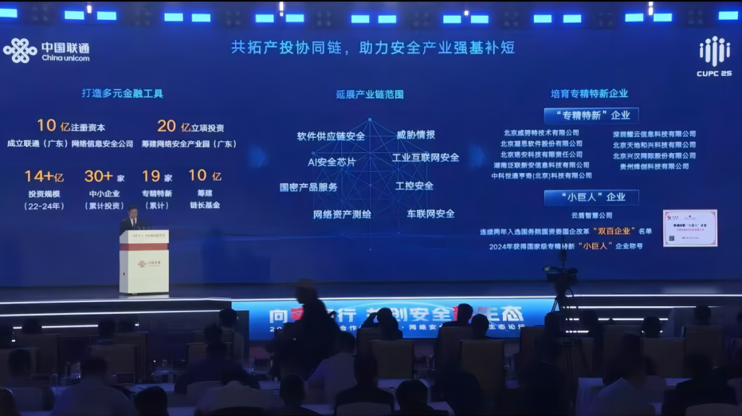 在网络安全共链行动生态论坛上,中国联通副总经理苗守野发表了题为“向实同行 共谱智能时代网络安全新篇章”的主旨演讲。他指出,中国联通坚决贯彻总体国家安全观,积极践行链长使命担当,努力做好产业链发展的“支撑者、引领者、组织者”;创新打造“科技创新链、安全能力链、价值创造链、产投协同链、生态聚合链”五链融合的工作新模式,联合产业链合作伙伴,取得了一系列重要成果。他在演讲中还特别提到了云盾智慧在国企改革和创新发展方面的显著成就,包括连续两年获国务院国资委国企改革“双百行动”企业称号、实力荣膺国家级专精特新“小巨人”企业称号等,是中国联通成功培育的产业领军力量。
